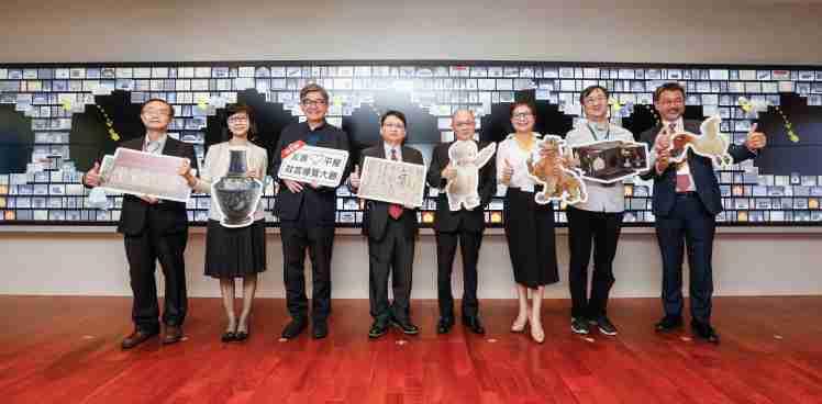 菠菜论坛携手创利空间为故宫建置的智慧文物互动导览墙及轮播墙,,,,今日正式启用。。。(左四:菠菜论坛新事业暨投资管理总部副总经理杨本豫、、、右四:故宫博物院院长吴密察、、右三:太极影音董事长黄宝云)