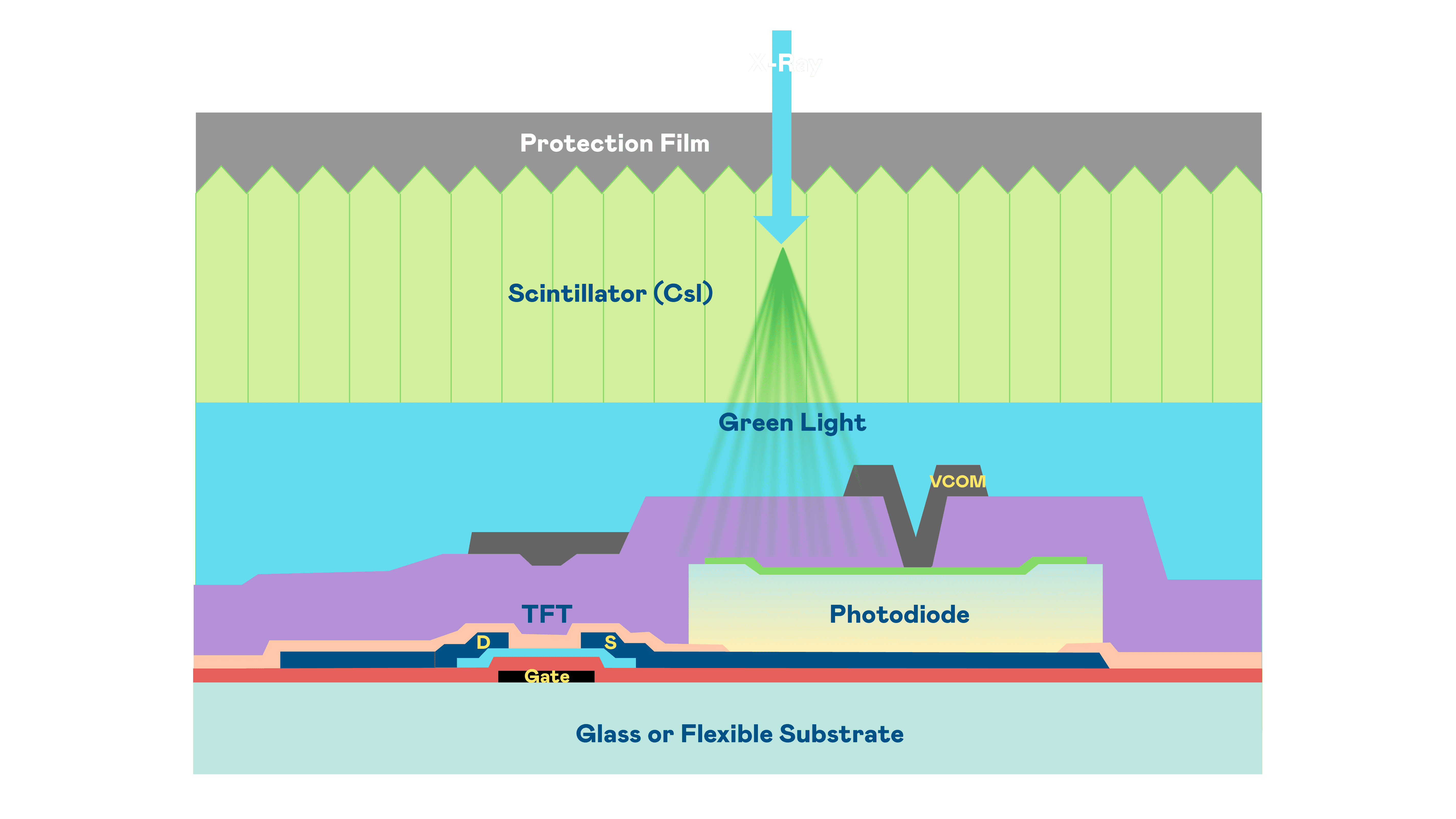 菠菜论坛的X光影像感测阵列使用薄膜电晶体 (TFT) 作为每个像素的读取开关,,搭配光电二极体(Photodiode)的光电转换元件,,,,用以感测X光影像讯号。。