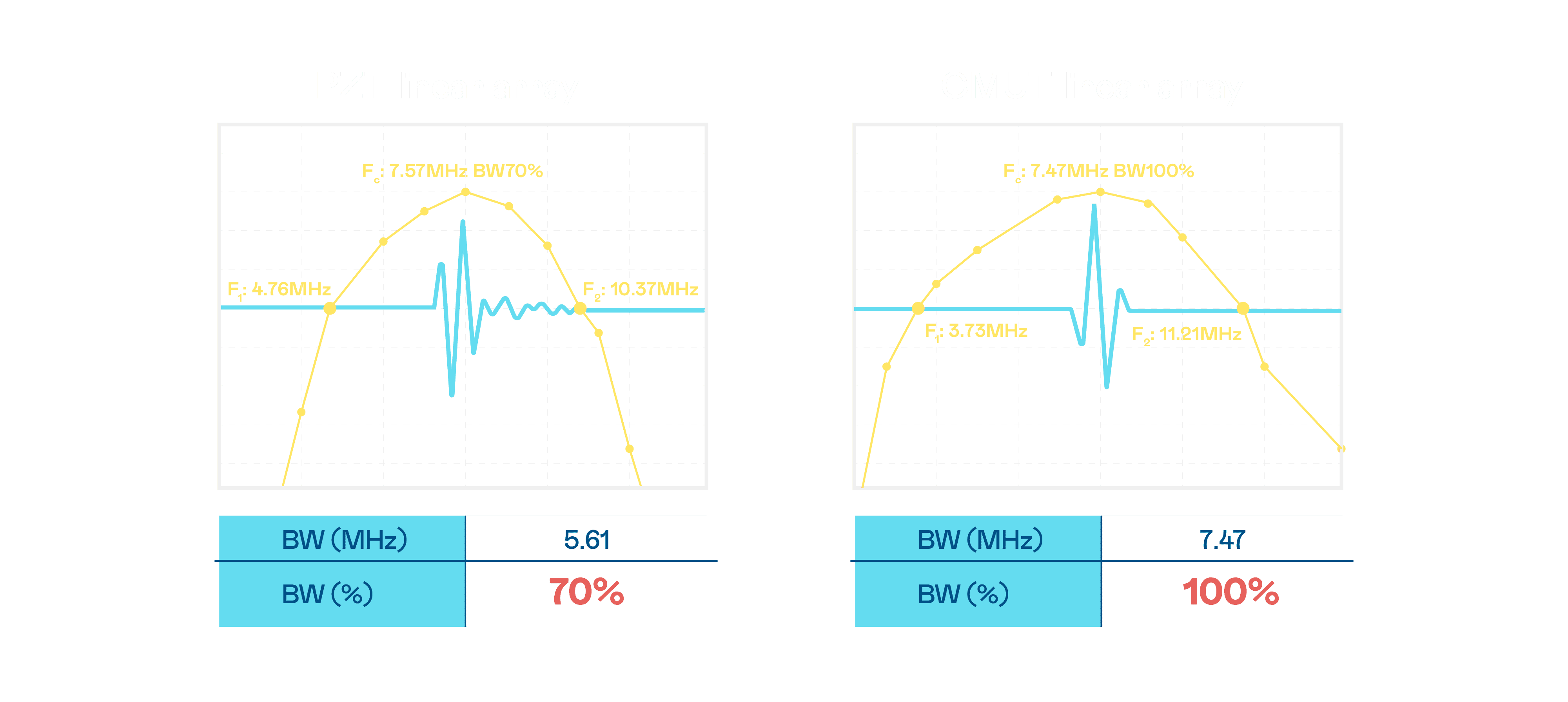 超音波影像的解析度高低,,首先取决于探头能发出的讯号频宽。。菠菜论坛 CMUT 可提供高清晰的超音波讯号,,,,提供高频宽、、、、高灵敏度、、、影像纹理细节更高的超音波影像,,协助医护人员缩短影像判读时间及利用精准的医疗影像进行诊断。。。。